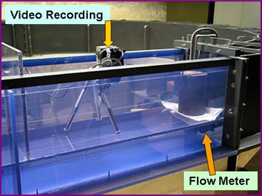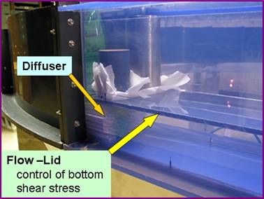 | In order to obtain a uniform flow cross section, a flow lid is installed (basically we have flow through a rectangular pipe). Lowering or raising the lid allows manipulation of the velocity profile within the channel and control of bottom shear stress. | Developing bed features and flow velocity, turbidity, T, pH, etc. are measured and recorded at the downstream end of the observation stretch. |