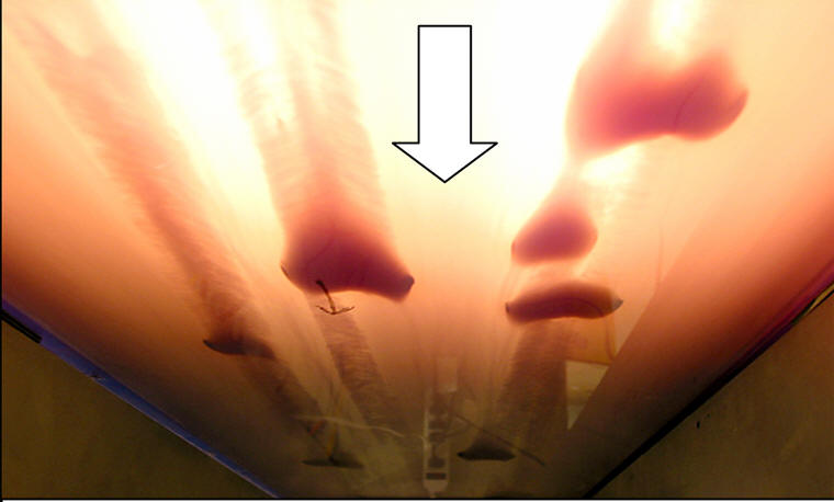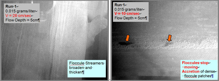 | Over time the floccule streamers broaden and thicken. | Until at some point dense patches of floccules begin to form that slowly migrate down the flume channel. Once these stop motion, congregation will over time lead to formation of a bottom-covering clay beds. |