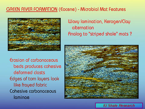Layers of wavy carbonaceous laminae that resemble microbial mat laminae from the mudstones of the Belt Basin also occur in mudstones of the Green River Formation. |